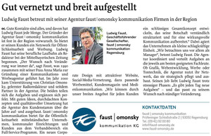Das „Mittelbayerische Journal“ portraitiert am 11. Mai 2016 in seiner Ausgabe „Köpfe, die bewegen - erfolgreiche Unternehmer aus der Region“ faust | omonsky kommunikation: