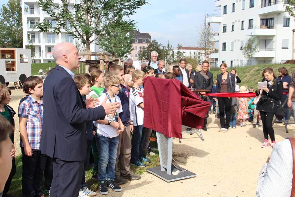 Ganz besonders ungeduldig gewartet haben die Kinder, endlich den Spielplatz benutzen zu dürfen. Zwischenzeitlich hatte die Stadt Regensburg Schilder an den Bauzaun gehängt. Darauf bat sie um Verständnis, dass der junge Rasen erst eine gewisse Stabilität braucht, bevor auf ihm getobt werden kann. In die Planung des Spielplatzes hatten Stadt und Ferdinand Schmack jun. GmbH die künftigen Nutzer direkt eingebunden. Kinder der Pestalozzi-Schule, des Domspatzen-Gymnasiums und vom städtischen Kinderhort „Hohes Kreuz“ bastelten Vorschläge für Spielgeräte, die zum Thema Zuckerfabrik passen. So erinnert der Spielturm an den ehemaligen Schornstein, den „Langen Heinrich“, ein Lastwagen bezieht sich auf die Rüben-Anlieferung während der Kampagne und der Wasserspielplatz auf die Rüben-Waschanlage.