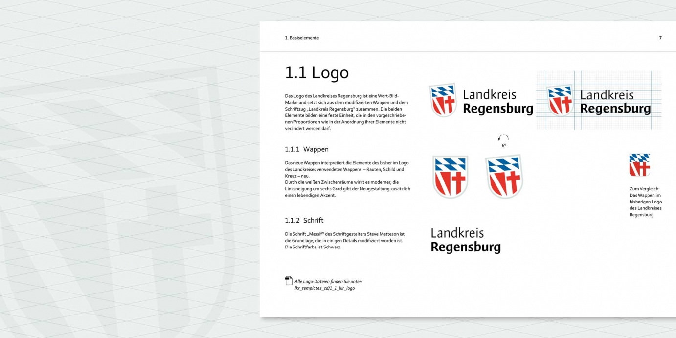 Als Logo des Landkreis Regensburg kommt nur eine Wort-Bildmarke infrage, damit eine unzweifelhafte Wiedererkennung möglich ist. Die Wort-Bildmarke besteht aus dem präzisierten Logo und einer eigens für den Landkreis Regensburg modifizierten Schrift. Die Bildmarke steht vertikal in der Mitte der Wortmarke. Das lockert, neben der Sechs-Grad-Linksneigung des Wappenschilds, die strenge Ordnung zusätzlich auf.