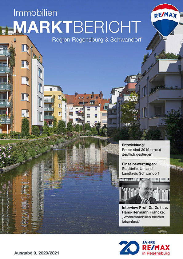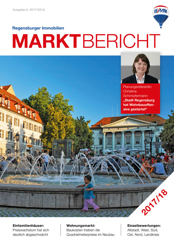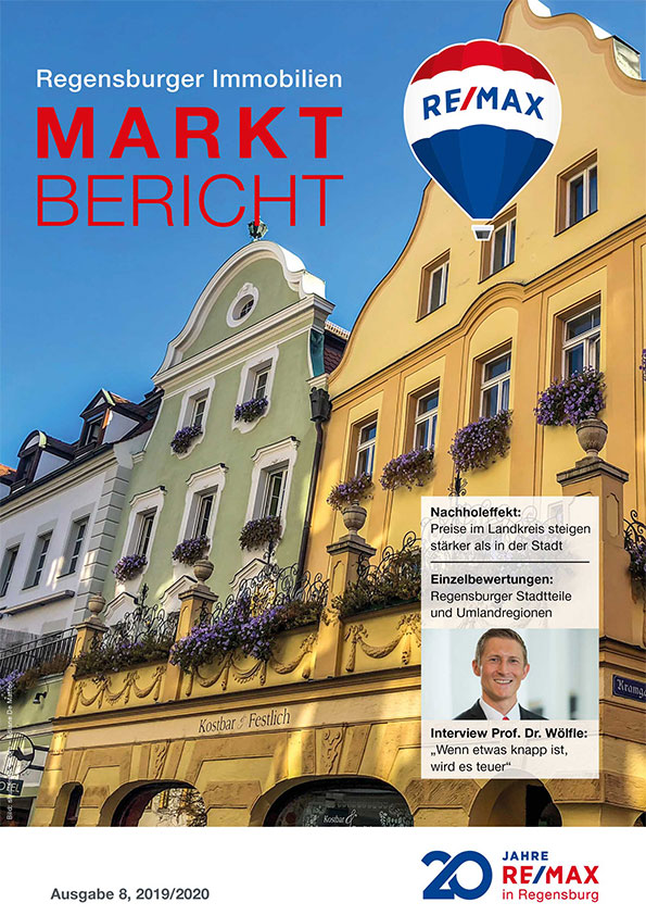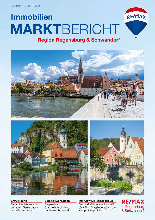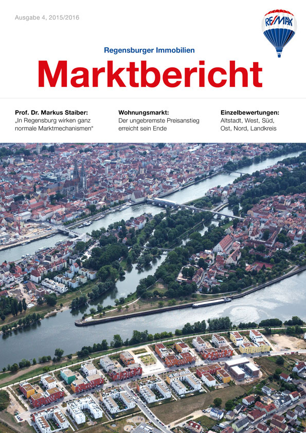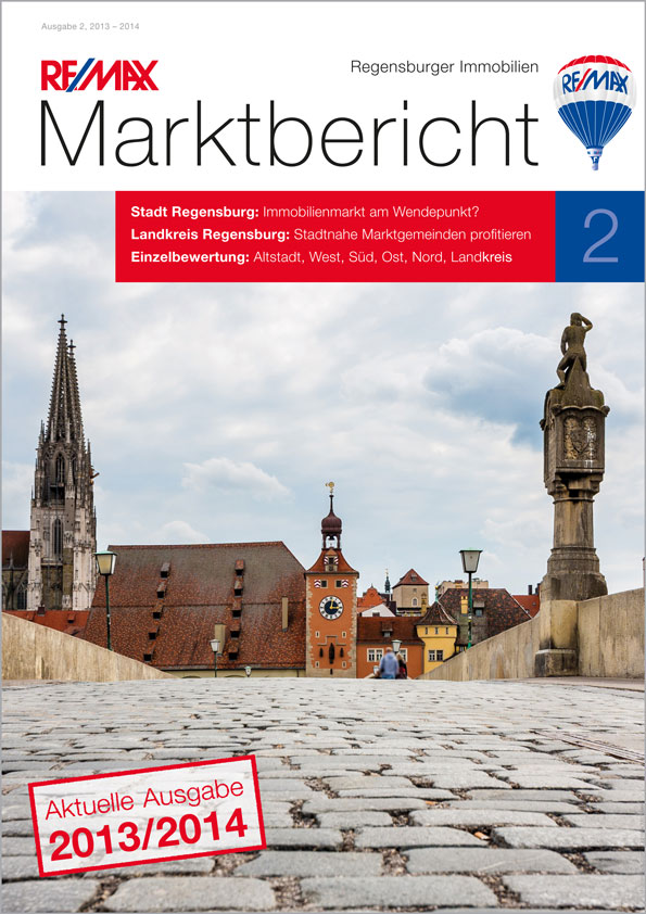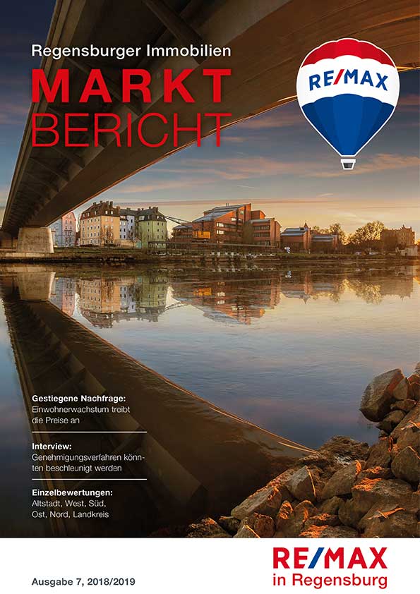 Seit 2012 informiert das Regensburger Immobilien-Maklerbüro von RE/MAX einmal jährlich über die aktuelle Marktlage. Ziel des Regensburger Immobilien-Marktberichts ist, den Kunden, Interessenten und allen Akteuren in der Region knappe und prägnante Informationen an die Hand zu geben. In die Bewertung fließt die gesamte Expertise aller rund 30 Mitarbeiter des Büros ein. Daten von renommierten externen Instituten sowie öffentlichen Stellen wie Stadtverwaltung und Statistikämtern runden das Bild ab.